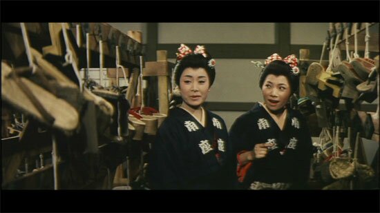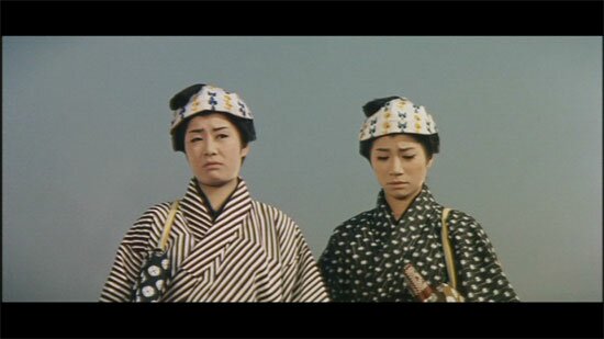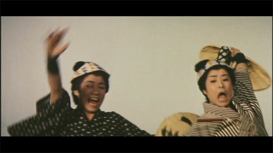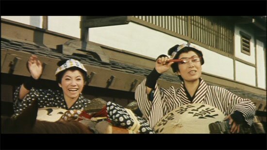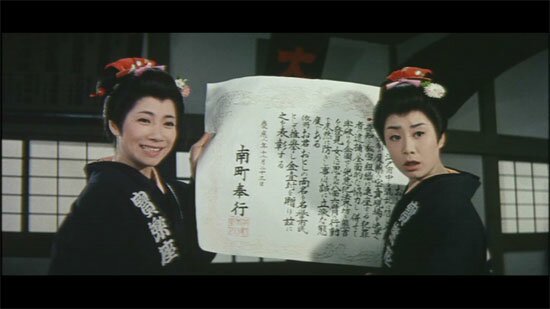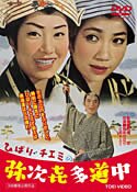 ![]() Hibari Chiemi no Yaji Kita Dochu (1962) Toei DSTD02373 Synopsis This is a tale of two friends. One is very near-sighted (Hibari Misora) and the other one is just plain crazy (Chiemi Eri). They currently work at a local theater in Edo hanging up the shoes of the patrons. They hope they will one day get a chance to perform on the theater's stage in front of an audience. ![]() Hibari and Chiemi hanging up shoes. One night, after everyone has gone home, they practice their singing and dancing on the theater's stage. Unfortunately, they accidentally fall through a hole in the stage and crash down into the basement of the theater. In the basement they discover a local drug gang and a beggar priest (Chiyonosuke Azuma) holding a meeting. The ladies are offended that these criminals are conducting their drug business in their sacred theater. The ladies threaten to report them to the police and the criminals respond by attacking them. This sets off a huge brawl in the theater that soon involves the police. Eventually the police are able to get control of the situation and the gang members, the beggar priest, and the two ladies are thrown in jail. The ladies claim they are innocent and demand that they be released from jail. The police refuse. ![]() The ladies in the slammer. While interrogating the beggar priest, the police discover that he is actually an undercover police officer who is attempting to infiltrate the drug gang to find out who the leader is. To help him in his mission, the undercover police officer asks them to allow him and one of the higher-ranking gang members to break out of jail. The police agree. The police finally agree to release the ladies from jail but the ladies have now changed their mind and they don't want to leave. They now have a few demands that have to be met before they agree to leave the jail. They want a written commendation from the magistrate and a monetary reward for their help in apprehending the members of the drug gang. The police chief scoffs at their demands and has his men pick them up and dump them outside the jail. As soon as they are released, they quickly run back into the jail and lock themselves in their old jail cell. The police chief decides he has had enough of the two and finally gives in to their demands. With the written commendation and monetary reward in hand, they go back to the theater and show them to their boss (Shunji Sakai). They hope he will be so impressed that he will give them a better job at the theater. Their hopes are dashed when the boss tells them they are fired. They have caused enough problems and he doesn't want his theater dragged into the mess with the local drug gang. He gives them some traveling money and sends them on their way. ![]() The ladies showing the written commendation to their boss. The two leave Edo and began traveling around Japan dressed as men. Meanwhile, the undercover police officer is getting closer to finding out who the leader of the drug gang is... ![]() The ladies (dressed as men) begin their journey. Review Hibari Chiemi no Yaji Kita Dochu is best described as a super silly live-action cartoon. Two of Japan's greatest songbird's, Hibari Misora and Chiemi Eri, come together to deliver a non-stop barrage of gags and songs. Hibari and Chiemi give extremely energetic performances and act like mischievous 12 years olds for the entire duration of the film. The chemistry between the two is great and they compliment each other nicely. Having Hibari and Chiemi in the same film is like having your cake and eating it too. If the film has a fault, it is that the identity of the drug lord is a little too easy to guess. By the time it is revealed at the end of the film, it isn't much of a surprise to the viewer. Although Hibari and Chiemi appeared together in films before and after this, I think this is easily the best film collaboration between the two. They sing and dance their hearts out and leave the audience with an ending that is guaranteed to leave a smile on the face of the viewer. Toei jidaigeki star Chiyonosuke Azuma plays the undercover police officer. In Hibari's films, Chiyonosuke excelled at playing characters who were skilled with a sword but were a little looney. Comedian Shunji Sakai, a constant fixture in Hibari's films, plays the theater owner. He is the father of Masaaki Sakai. Last summer, Toei asked fans which Hibari films they wanted to be released on DVD. This film came in tenth place (the highest ranking for any of the Hibari/Chiemi collaborations). http://www.toei-video.co.jp/DVD/sp21/hibaridvd.html#report Film Highlights: